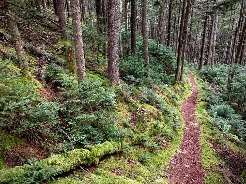 1.9 miles one-way from trailhead to junction with West Ridge trail, blue blazes