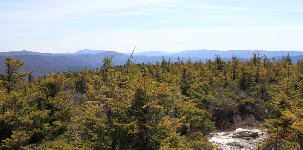 At the highest point on the Bald Mountain trail is the junction with the West Ridge Trail, which runs 7.8 miles to Glastenbury Mountain summit and has no other exit. Follow the West Ridge 0.1 mi. to the true summit of Bald, where there are limited views at a comfortable picnic spot. Return to Bald Mountain trail to descend.