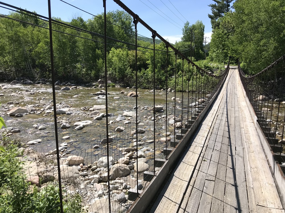 Head downtown from the Edward Finn parking lot and cross NH-16 at any of several crosswalks to face the direction of traffic. Follows sidewalks past the center of town, town common, playground, and the residential area of lower Main Street. Cross the Peabody River on the US-2 highway bridge. Here, a dirt shoulder provides a softer path next to Gorham's Country Golf Course.
