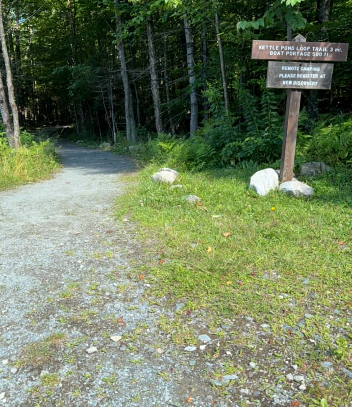 From there, stay right for the narrower and more rugged natural surface loop trail. At the far south end of the pond the trail is rocky and wet. After traveling the perimeter of the pond, the trail travels past the Kettle Pond Group Camping Area, returning to VT-232 along the gravel campground road. Travel a short distance north along the shoulder of VT-232 to return to the parking lot.
