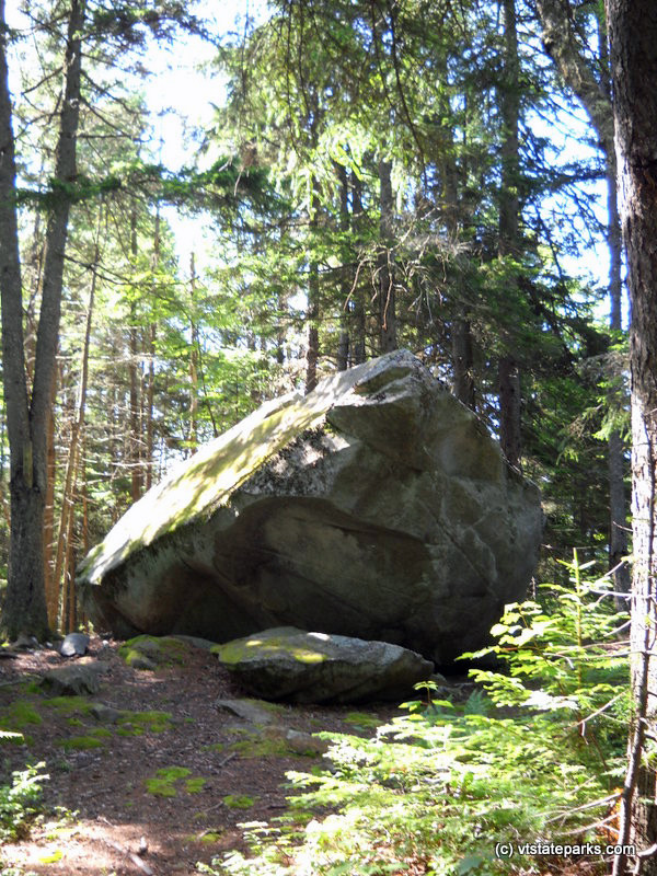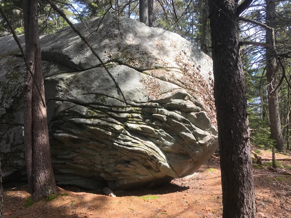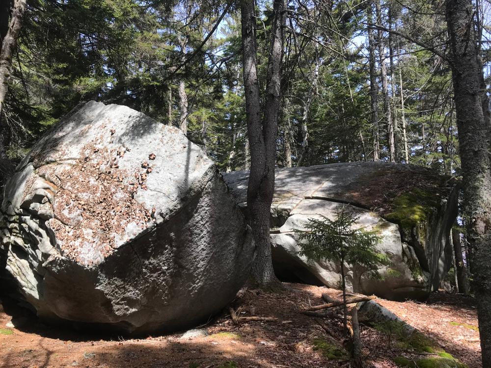 The trail to Silver Ledges departs the Beaver Brook Road and immediately crosses Beaver Brook using a series of natural boulders. After the brook, the trail follows level terrain through open hardwoods for a short distance before climbing steeply for just under 0.5 miles. The trail is highlighted by numerous boulders as well as abundant blueberries and softwoods that thrive on shallow, acidic soils. Just below the summit, a short spur offers views to the southeast from a small ledge (including to Mount Moosilauke in the distance and Beaver Meadows below). At the summit, the trail ends at a large split boulder with nearby views of Lake Groton, Little Deer, and Big Deer Mountains to the north.