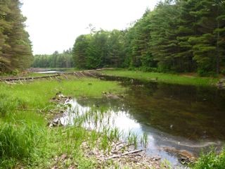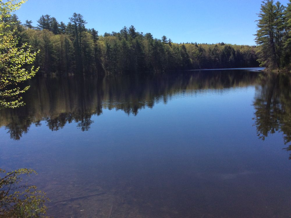 The first part of the trail is along a snowmobile trail with a slight incline, 0.2 miles to the pond. The snowmobile trail turns right and the hiking trail is straight ahead. Around the pond it's flat, with a small brook crossing over some rocks. At 0.7 miles, turn right back onto the snowmobile trail which runs past the concrete dam, then an earthen dam and back to the trail split, left and back down to the trailhead. The upper end of the pond where the incoming brook runs into the pond is tricky; you have to clamber over the brook on rocks. In winter, the rocks can be icy, and in spring, the high water can make the crossing difficult. There is also a section of the trail that is over a rock field. The beginning of the trail is through hardwood with a few pines, logged in 2005. The other side of the brook is mostly thick and untouched hemlock. There are many deer signs and an occasional moose. There are also many birds, and, in the migrating season, the pond holds ducks and geese.