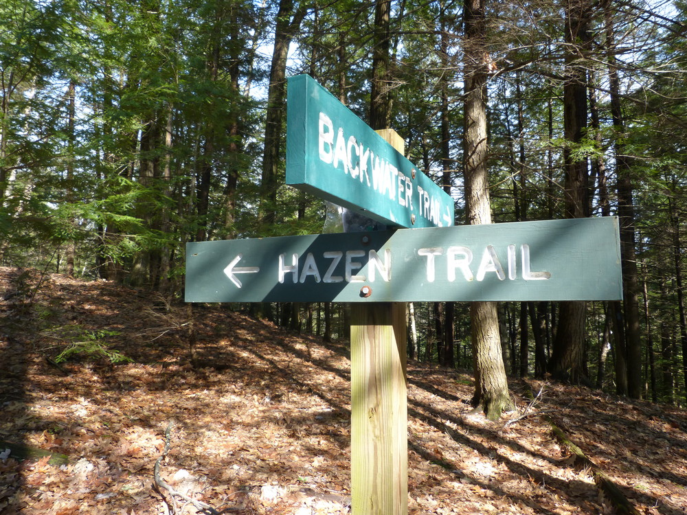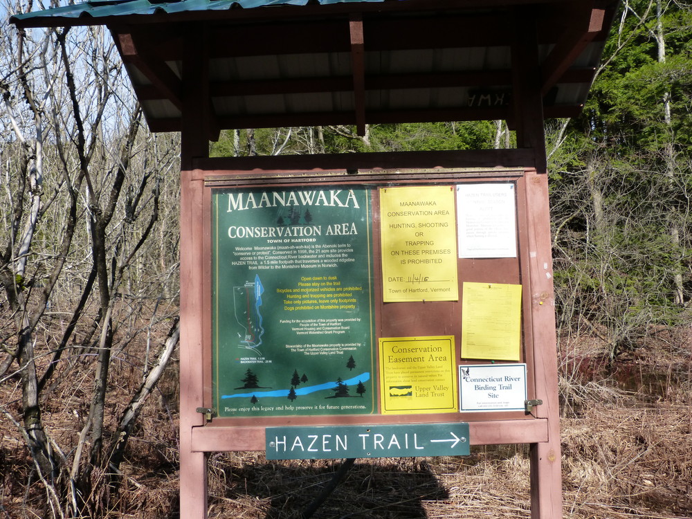 A kiosk to the right of the parking area provides information about the Maanawaka Conservation Area where the Hazen Trail begins. From the kiosk, the trail rises up into the woods and, in about 100 yards, meets the junction of the Backwater and Hazen Trails.