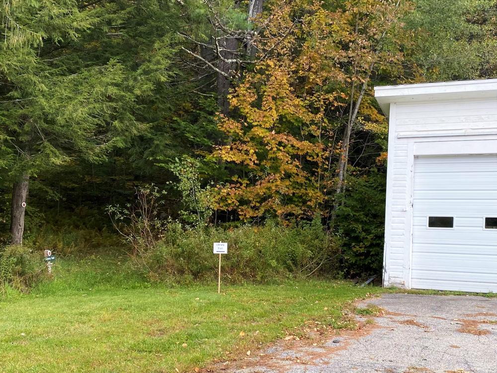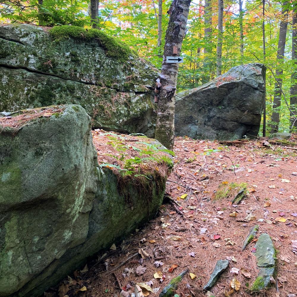 The trailhead is to the left of the shed garages on the town hall parking lot, indicated by a trail sign that says "Library Trail" and is marked with paw print blazes.