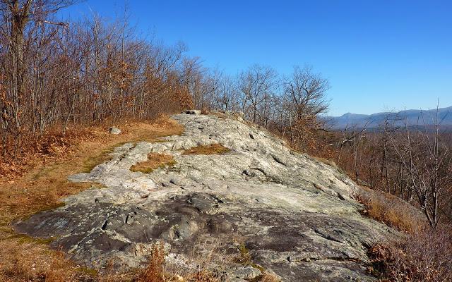 The trail begins by climbing up rock steps. Shortly thereafter, two small dirt paths merge from the right, the trail to the summit continues along the path marked by blue blazes. A small stream flows down to the right of the trail. About a third of the way to the summit the trail crosses the Suicide Hill Snowmobile Trail. On the far side it crosses some wooden bog bridges, as well as another trail branching off on the right.