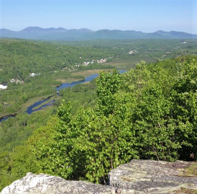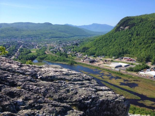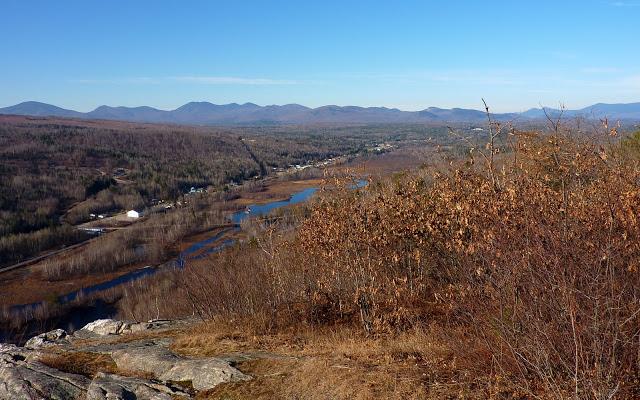 After one final short uphill climb, the trail emerges on the rocky summit of Mount Jasper. The City of Berlin and the Dead River can be seen to the south, with Mount Jericho with its wind turbines visible across the river. Continuing around the summit, there are nice views to the northwest, which includes more of the Dead River and the Kilkenny Mountain Range.