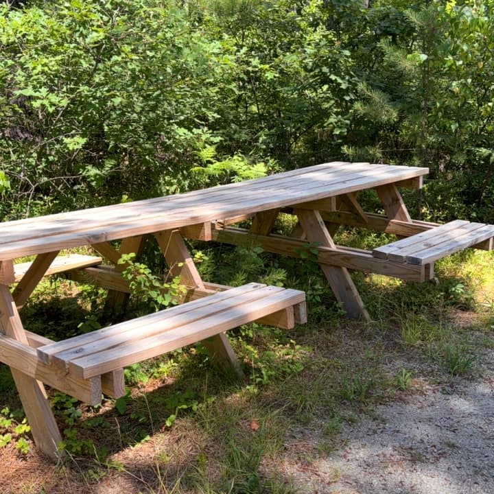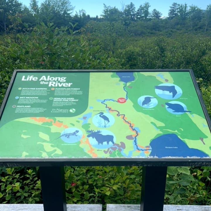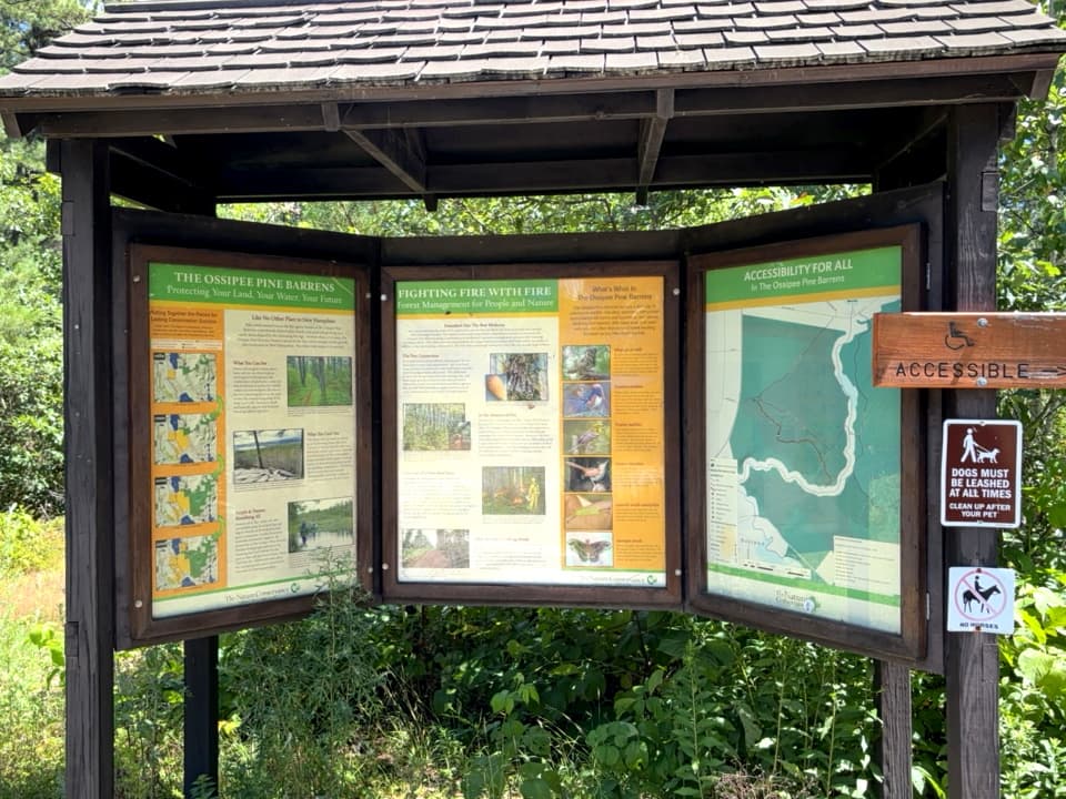 Accessible Trail - 0.8 miles (green/yellow blazes). This graded, five-foot wide trail is constructed from hard-packed sand and gravel, making for flat easy travel by the young, old and explorers of all abilities, including those pushing strollers or using wheelchairs. It offers an easy excursion through classic pitch pine-scrub oak barrens, and the opportunity to experience a variety of unique birds and other wildlife seldom encountered elsewhere in the state. The trail crosses under a power line just before reaching an observation platform overlooking the West Branch of the Ossipee River at the terminus of the trail, complete with a view of Mount Whittier and the Ossipee Mountains. See Trail Access Information below for more information about this Accessible Experience.