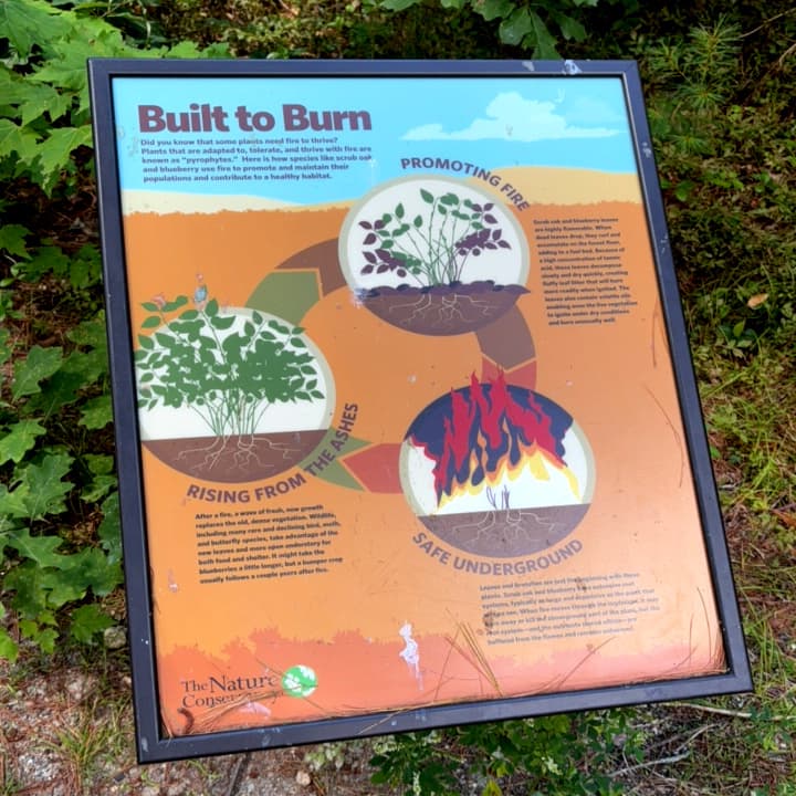 Forest Ecology Loop Trail - 1.2 miles (red blazes) - This flat hike winds through pitch pine-scrub oak woodland recently (2013) treated with prescribed fire.