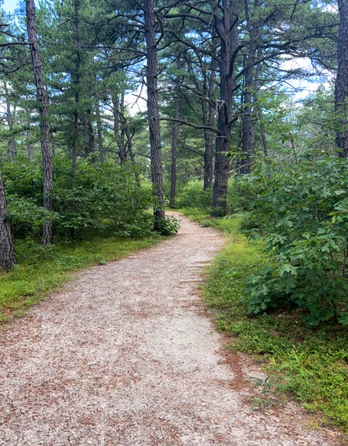 Pine Barrens Trail - 0.7 miles (red blazes) - This trail, a Class VI Town Road, cuts across the West Branch Pine Barrens from the Route 41 kiosk to East Shore Drive near the south end of Silver Lake. Note: This is NOT a loop trail.