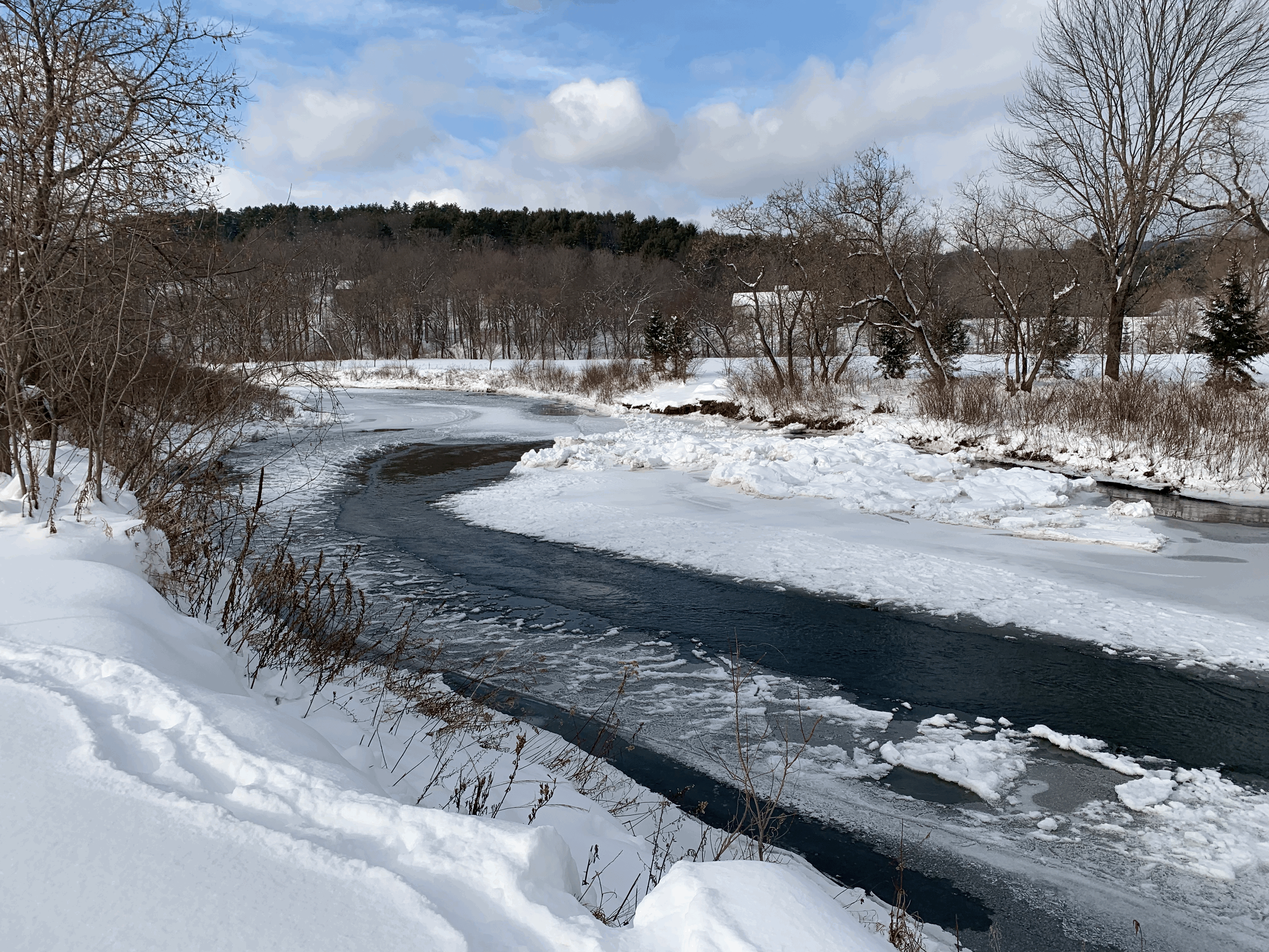 The trail not only provides views of the Ottauquechee River, but also across the river to the Billings Farm & Museum’s pastoral grounds and other historic mansions and fields on River Road, the primary 19th century roadway into Woodstock.
