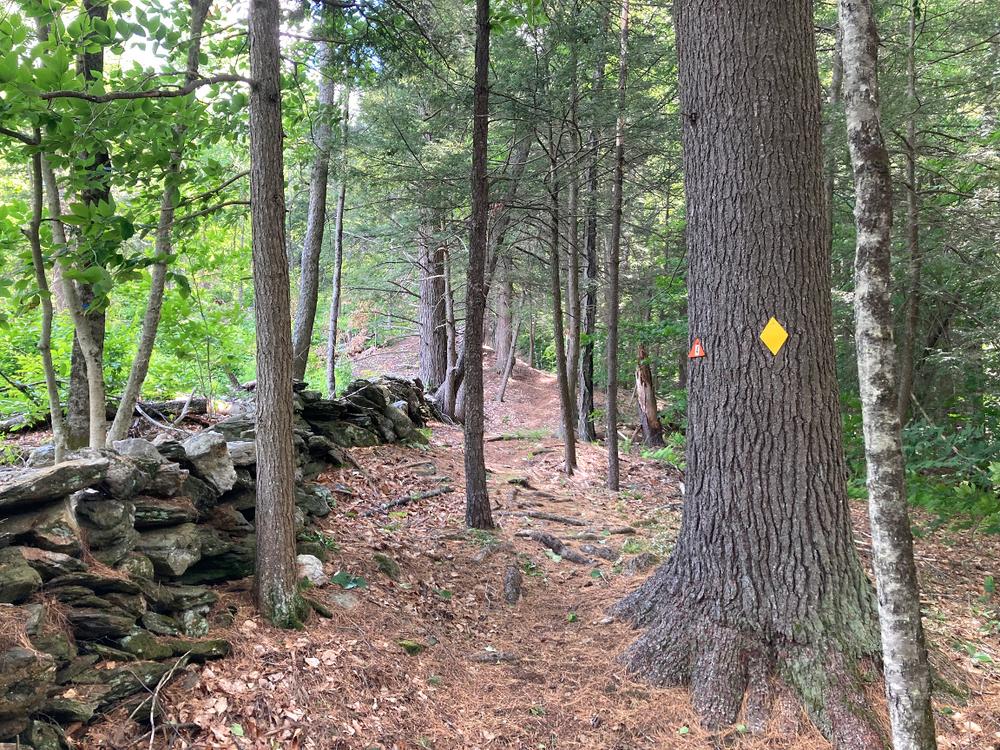 At the top of the hill, the trail passes through the right side of the clearing and renters the woods, where it then descends to a trail junction. The white-marked Missing Link Trail, managed by the Putney Mountain Association, turns left here and continues to Hague Road and the Haydock Vista.