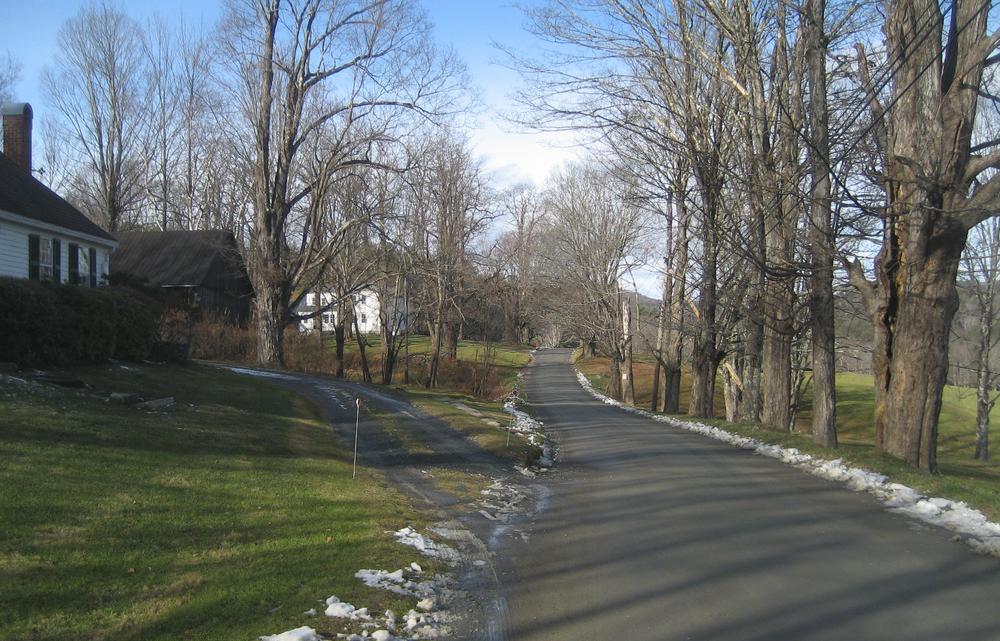 Road walk: From the parking area on Middle Rd near the church and town offices in Dummerston Center, walk north to the four-way intersection, cross East West Rd, and continue straight on paved Bunker Rd. In 150 yards, Bunker Rd bears right; you should continue straight onto unpaved Park Laughton Rd. Walk 0.3 miles farther (about 10 minutes) past beautiful fields and historic homes to the beginning of the trail on the left side of the road, marked by a post in a field. It is just beyond the crest of the hill and past house #133.