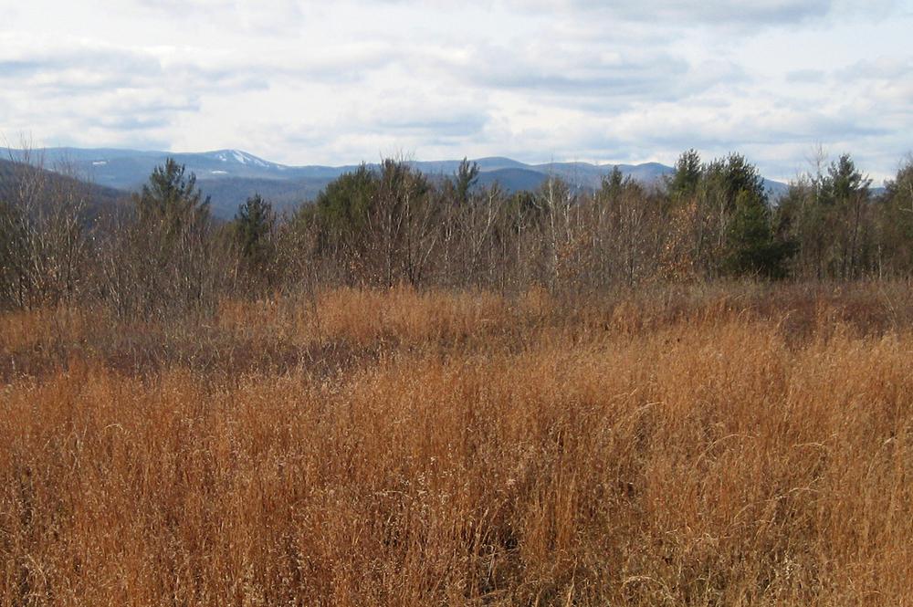 The trail soon makes a sharp right turn and climbs to the open clearing near the top of Prospect Hill. Views behind you are towards Mt. Monadnock in New Hampshire, while views in front of you look towards Mt. Snow.