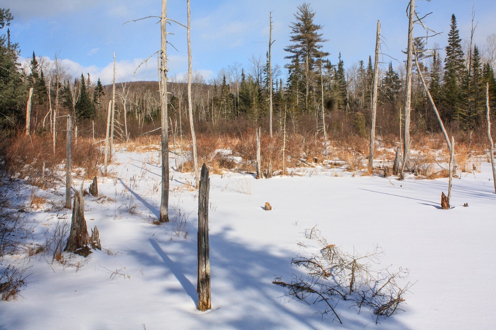 As you start down the Yellow Trail, you soon pass through a wide power line corridor and then bear to the left. Proceed down the trail until you come to the junction with the northern end of the Red Trail. Turn right here, continuing to follow the Yellow Trail over several bog bridges past a junction on the left (the southern end of the Red Trail), and then bear right. The trail passes over more bog bridges and then takes a sharp left onto a wider trail. Walk down this corridor and bear right at an old fork. The trail now crosses some bog bridges and soon emerges into more open woods. As you approach the junction with the loop portion of the Yellow Trail, you will see a wetlands area on your left which was created by beavers that once frequented this area.