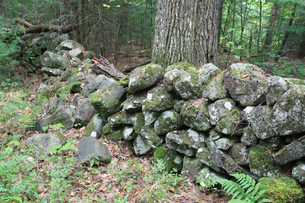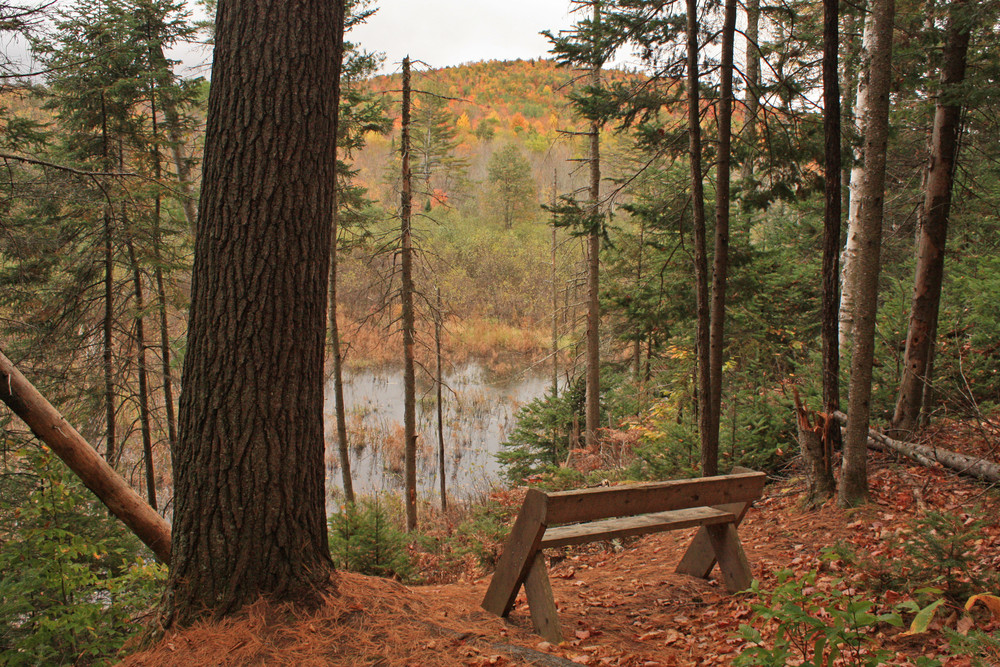 Walk past the loop junction and head uphill. You will soon pass a bench on your left and a plaque noting that this spot is in memory of John McIlwaine, who for many years was the president of the Ammonoosuc Chapter of NH Audubon. The bench offers a nice view of the hills to the east. Continue uphill—and then downhill—along the trail, soon bearing right. The trail now runs next to an old stone wall, passes through a wet area, and begins to climb up a hill. After a few minutes of steady uphill walking, you will come to an old woods road. Turn right and walk along the road, which follows another stone wall. Eventually, you will bear to the right and head back down the hill. When you reach the bottom of the hill, follow the trail through open woods back to the junction near the wetlands area. Turn left and retrace your steps back out the Yellow Trail to the trailhead.