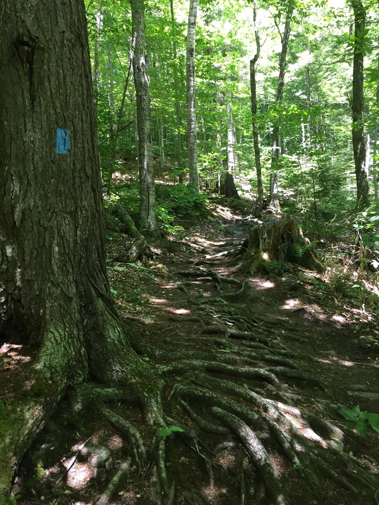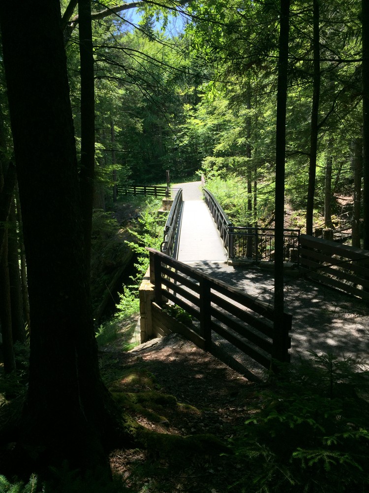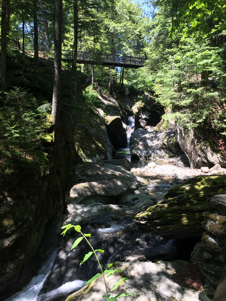 From the upper parking lot, the trail meanders through the forest along Hancock Brook 0.3 miles toward the Texas Falls observation sites. At the various observation sites and the bridge over the falls, hikers can see the series of cascading falls and the potholes carved into the rock by glacial meltwater.