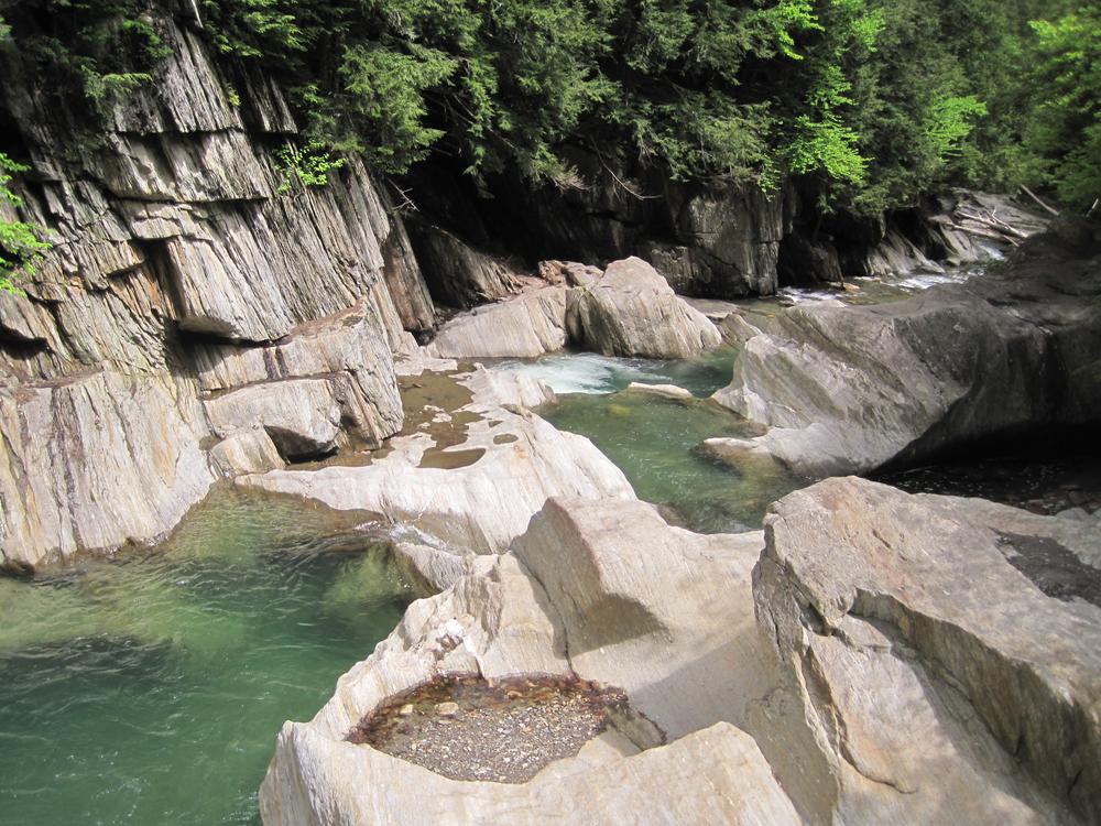 Warren Falls is a heavily-used observation site on the Green Mountain National Forest with high cliffs, fast water, deep swimming holes, and multiple footpaths. Acquired by the Forest Service in 1998, this area has a history of heavy use from locals and tourists, where one of the more popular activities is jumping off cliffs into swimming holes. Short loops provide access to various viewpoints and the Mad River. The river is cool and refreshing and the area’s beauty makes it worth visiting despite the crowds and parking challenges.