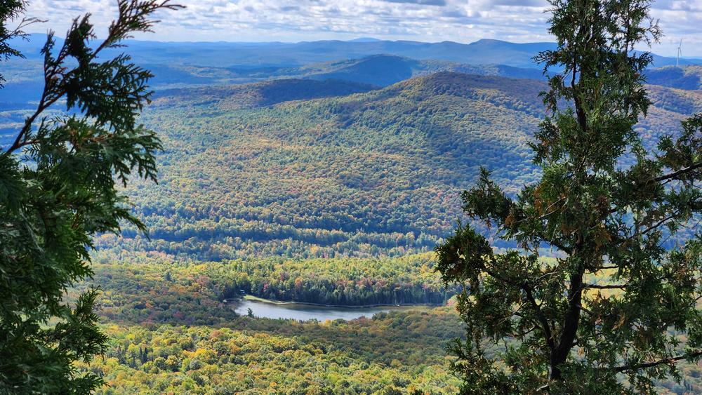The summit of Mount Hor offers nearby views of the surrounding ponds and a distant view of the Green Mountains. From the other trail lookouts, hikers can see Lake Willoughby, the cliffs of Mount Pisgah, and in the distance, the White Mountains, Owl's Head, and Mount Orford.