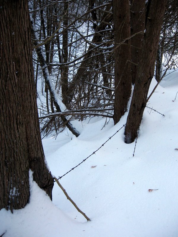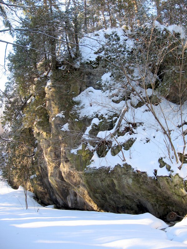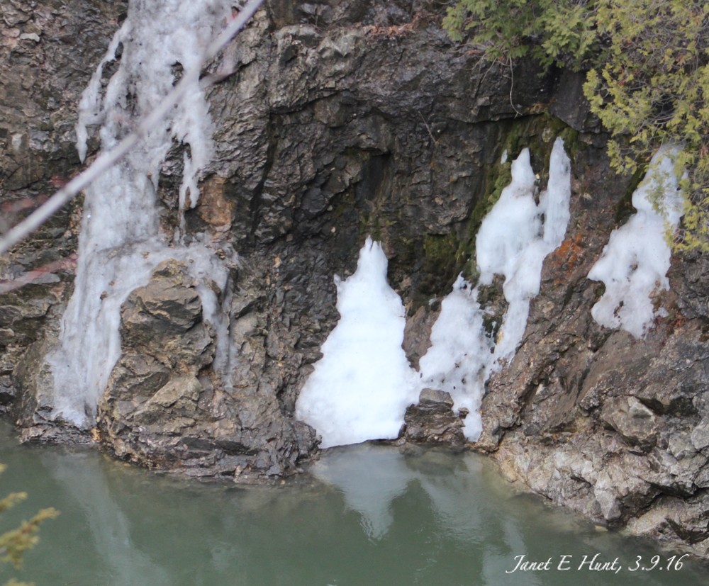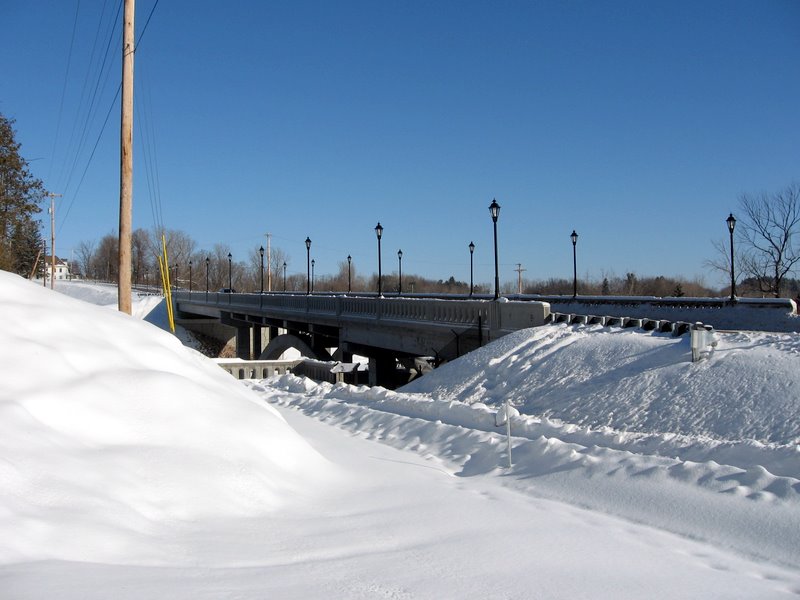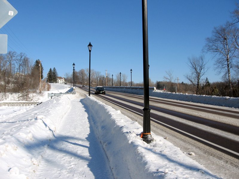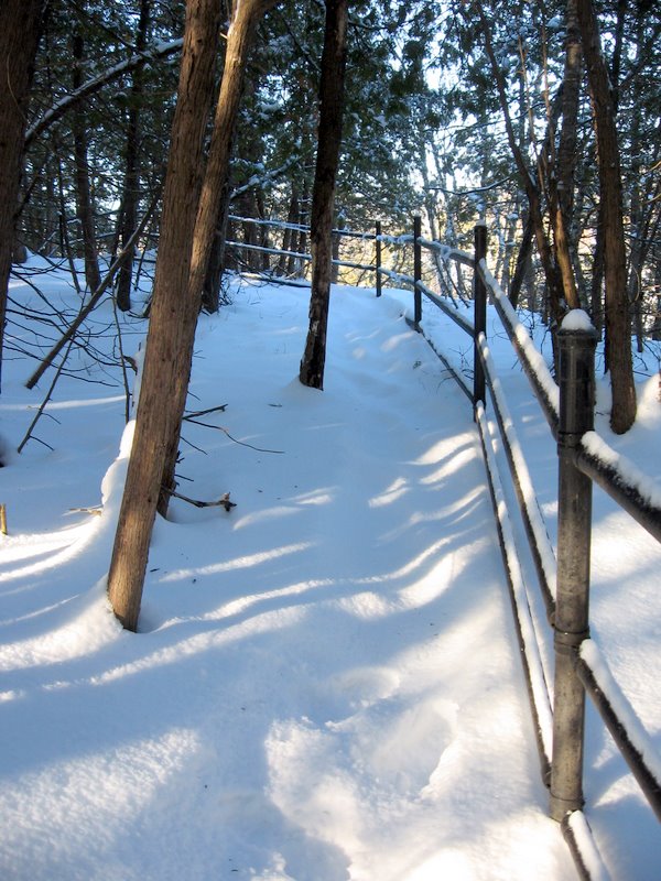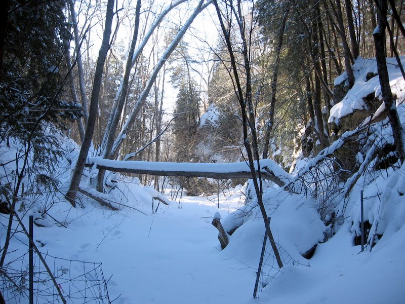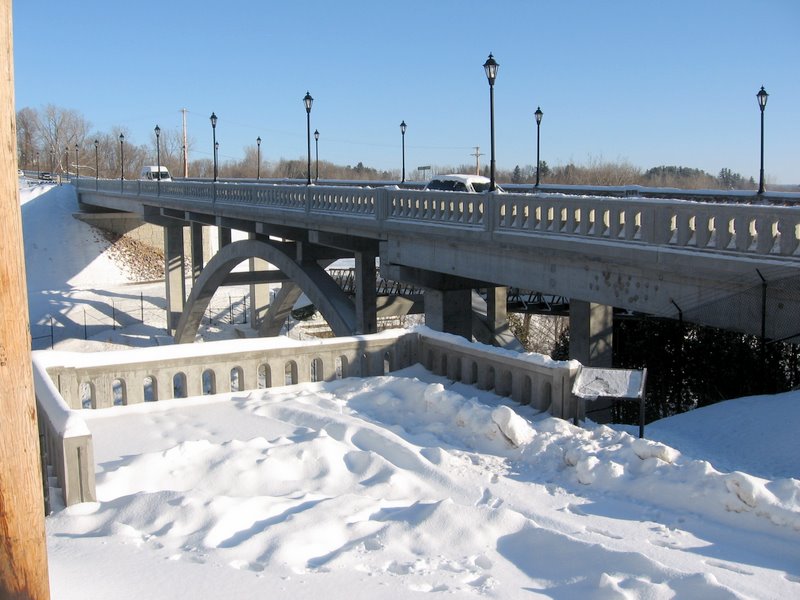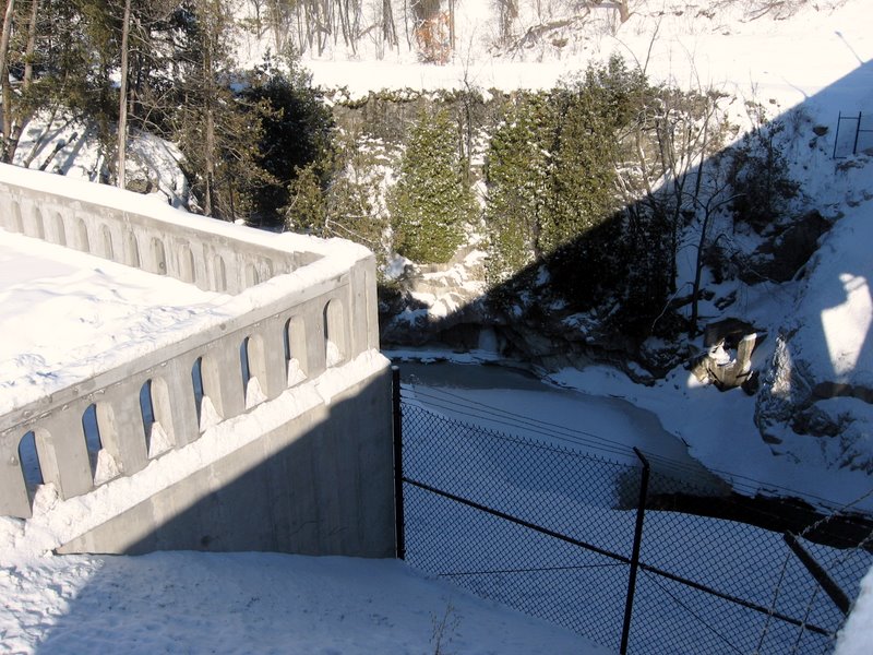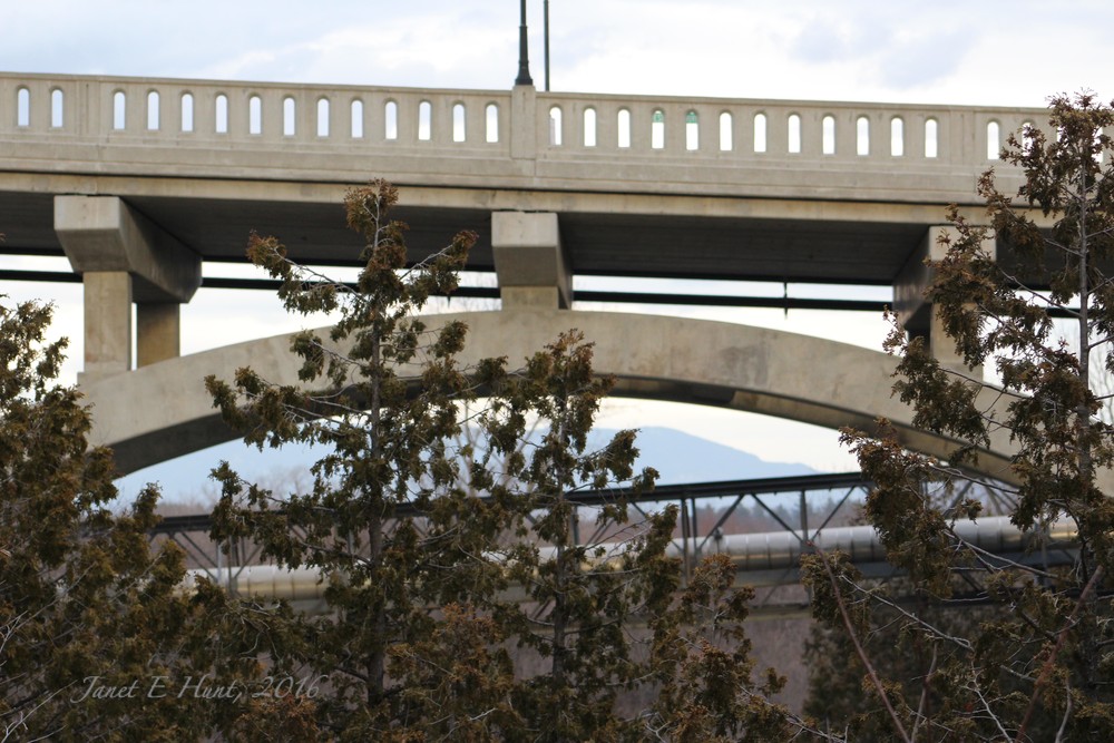 Wooded trail. Follow iron railing to the left and steep trail descends to Winooski River. Following railing to the right brings you to an observation platform overlooking the gorge below and underside of bridge.