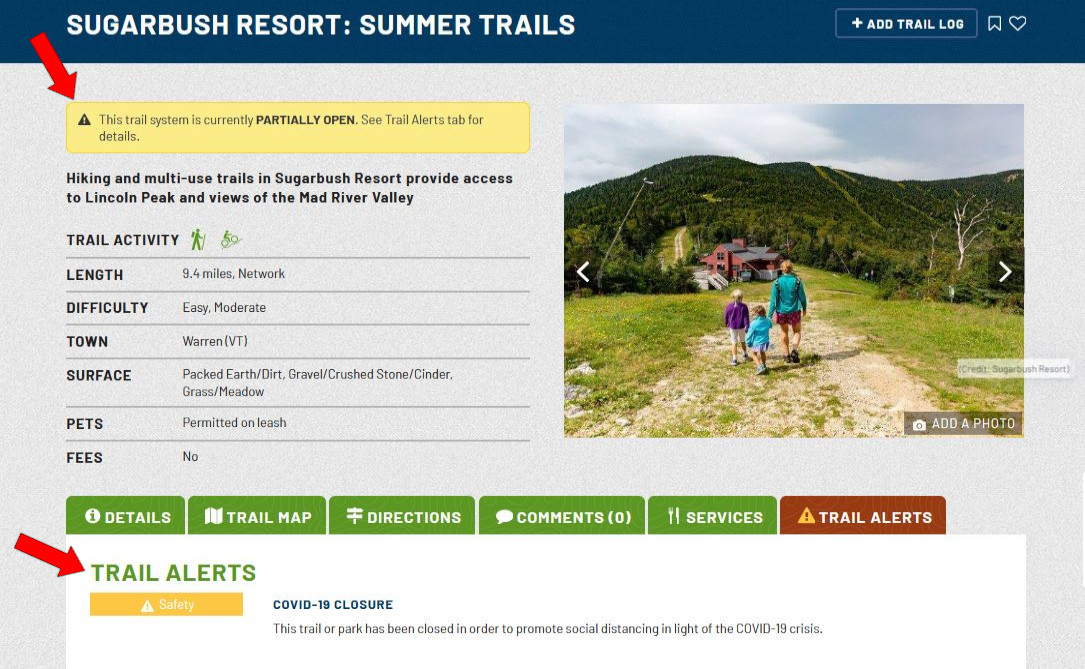 top of its Trail Finder page, with additional information under the TRAIL ALERTS tab.