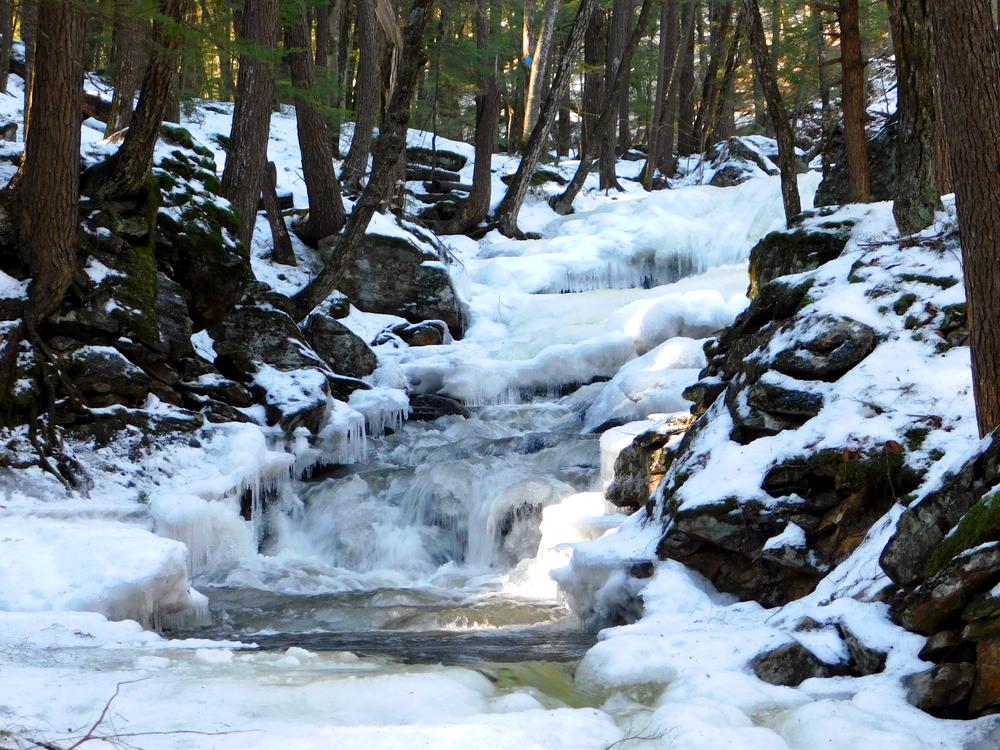 The half-mile Two Brook Trail crosses Scataquog Brook, which flows north into Cold Brook. The trail then loops, runing upstream along Cold Brook to the beautiful Senter Falls, and then up steeper slopes.