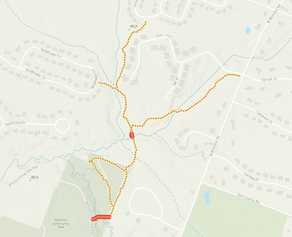 Parking to access the trail is available at the Williston Community Park entrance behind the Williston Central School, as well as the parking lot across from the Williston Federated Church and behind the Korner Kwik Stop off North Williston Road.