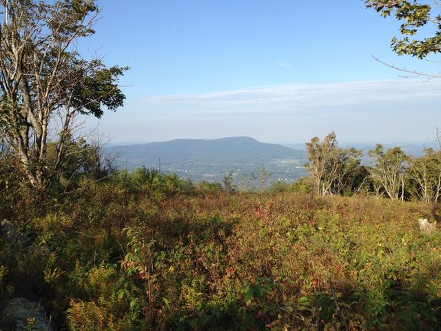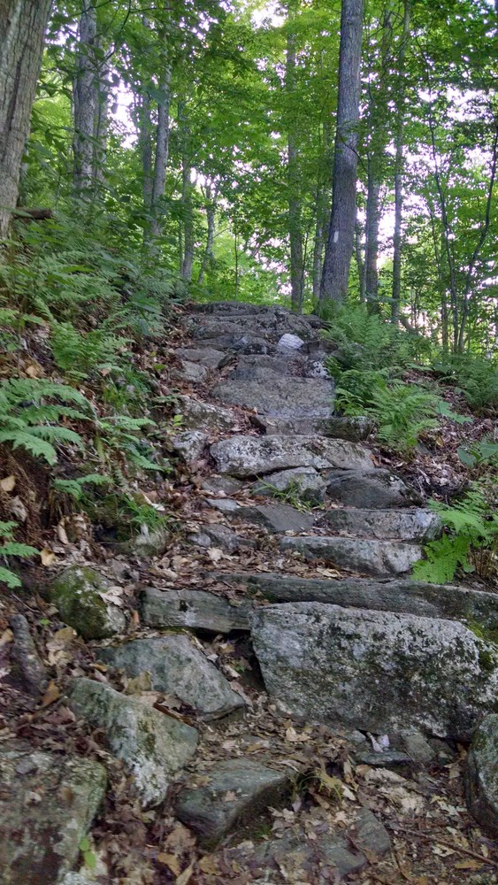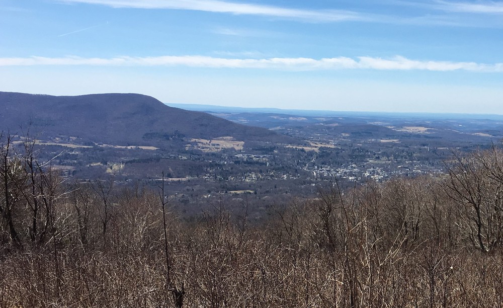 This section of the AT/LT, blazed in white, heads south to the summit of Harmon Hill. The trailhead is found on the opposite side of Route 9 from the parking area. Here the trail immediately enters the woods and begins its very steep ascent using rock staircases and switchbacks. Extreme caution should be used in wet, snowy, or icy conditions. It is much easier going after the steps. The grade gradually moderates as the trail bears left, then right, and finally reaches the open summit of Harmon Hill. Prescribed burns, forest fires deliberately set and controlled by trained Forest Service fire crews, maintain the historic opening and the vistas of the surrounding landscape. The view is particularly fine to the west where Bennington, including the 306 foot Bennington Battle Monument, the prominent Mount Anthony, and other hills and mountains of the Taconic Range stand out.