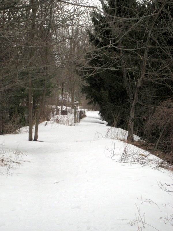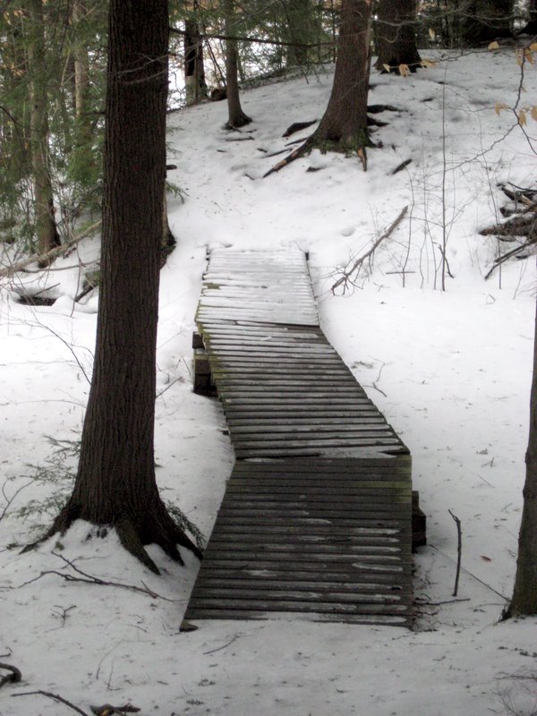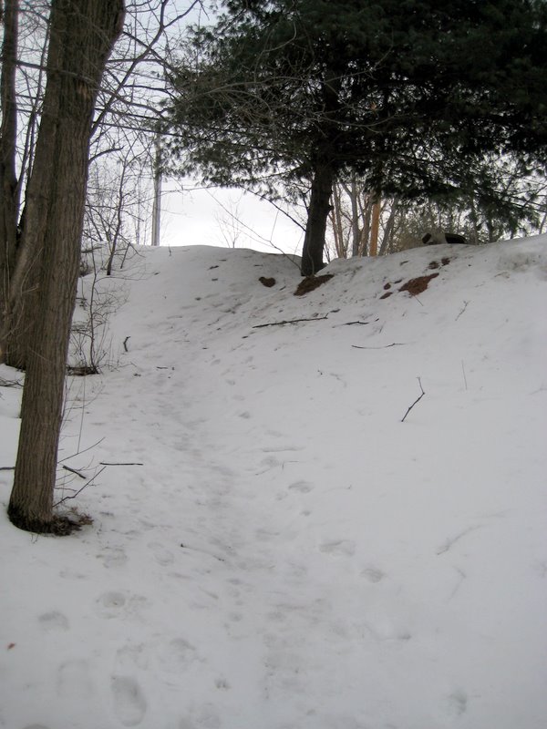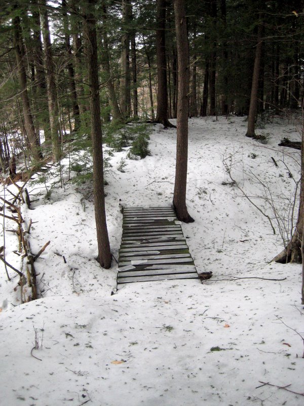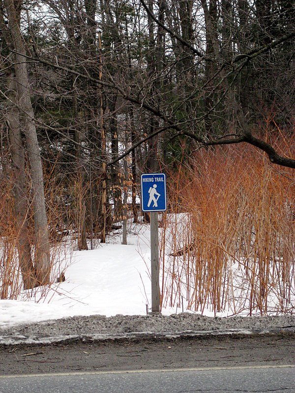 The trail begins behind the South Burlington High School artificial track. A point of interest nearby is a seasonal snowboard training park built by South Burlington High School team in 2007. The foot path goes along the direction of Kennedy Drive, but is set back in the woods about 500 yards or so from Kennedy Drive. It is separated from Kennedy by a spur from Potash Brook watershed.