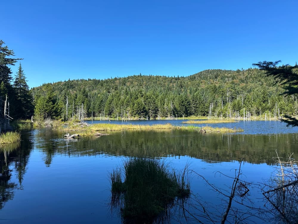 From the left turn at the Belvidere Saddle, the Long Trail proceeds north to follow the ridge through spruce-fir forest, then continues through hardwood forest with several openings before approaching a sag at Lockwood Pond. The trail bears to the right around the south shore of the pond, before reaching the Frank Post Trail and Tilloston Camp, 2.4 miles from Belvidere Saddle.