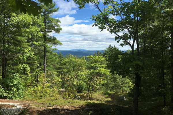 The lower slopes of Black Mountain are covered by hemlock and hardwoods such as sugar maple and beech. The pluton’s steep upper slopes and summit include craggy granite bedrock ledges covered by a thin layer of poor acidic soil. Here where nutrient-needy and water-loving plants can’t grow, the only pitch pine-scrub oak woodland in Vermont flourishes. Smallish pitch pines, red and white pines, oaks and red maples, lift gnarled limbs above a grassy glade cloaked in lowbush blueberry and huckleberry. Lichen-covered glacial erratics – boulders dropped by melting glaciers – are scattered about. From the top of Black Mountain there are views as far as New Hampshire’s Mount Monadnock, and into the West River and Connecticut River valleys.