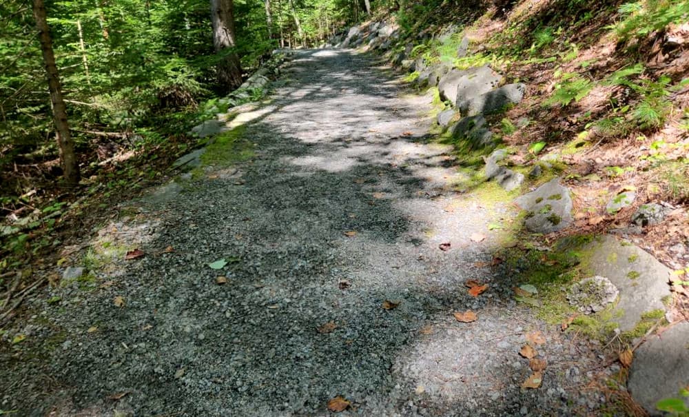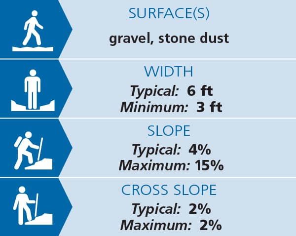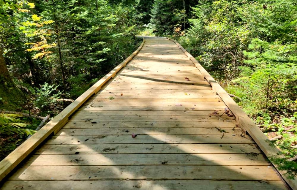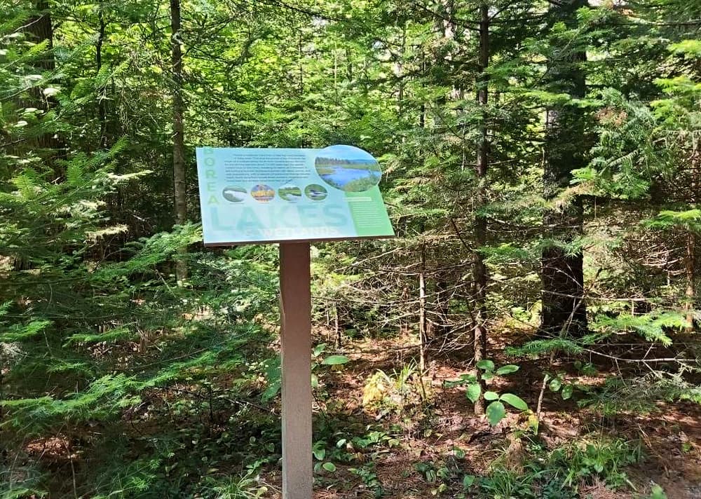 The Boreal Forest Trail starts behind the nature center and makes a 0.3-mile loop. The trail is relatively flat with a typical slope of 4%, with some steeper sections reaching 15% slope. There are pull out rest spots near the steeper sections. Cross slopes are a steady 2%. The trail surface is 3+ feet wide with a crushed stone surface. There is a small section of boardwalk as well. Use of the Boreal Forest trail requires a day fee during the camping season. See Trail Access Information below for more information about this Accessible Experience.