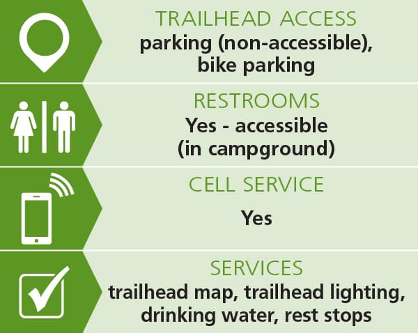 To access the parking area, turn right when the park road comes to a T, then turn left on the campground loop and then left on the spur road to the parking area.