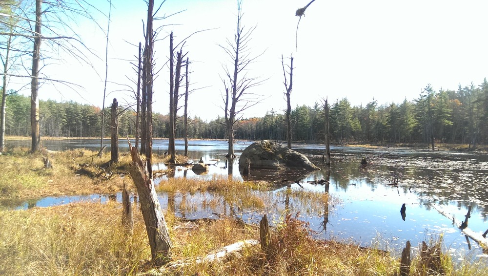 From the parking area at Portsmouth St., the Marsh Loop (Orange) can be reached by walking east on a paved dead-end road parallel to I-393. Pass around a large metal gate and continue walking to the marked trailhead on your left shortly after passing a small pond. Watch for great blue herons in the pond. Upon leaving the paved road and entering the woods, the Marsh Loop goes northeasterly, passing a wetland on the left with many snags. Stop and check for birds or a beaver. Following the trail further brings you to a woods road. (The road heading to the left is to the UNITIL substation site.) Turning right brings you to the junction with Frost Rd., and the Howard C. Nowell Trail to Curtisville Rd. in both directions as described above. Taking the Blue/Orange Trail to the left and then the Orange Trail to the left brings you to the power line and a path back to the parking lot.