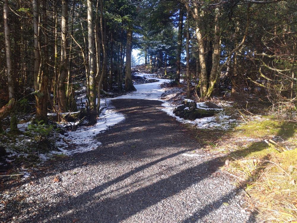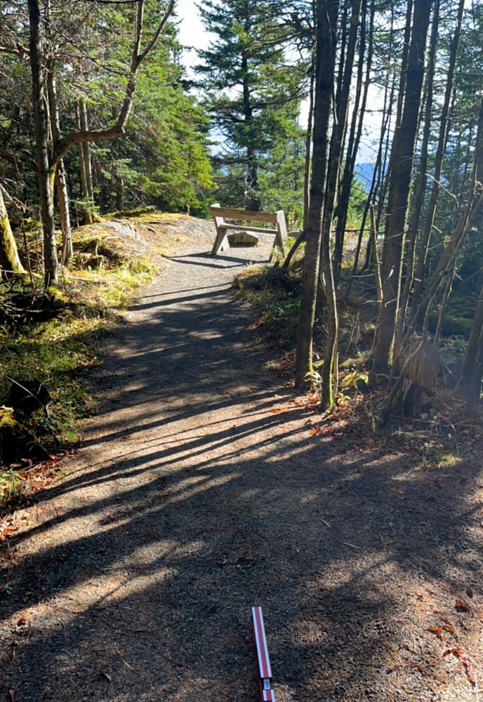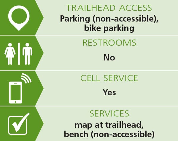 There is a 250-foot long hard packed trail from the upper parking lot to a vista. The trail is at least 38” wide. It is a steady 9-12% slope from the parking lot down to the overlook with a few turns. A bench at the overlook is not accessible and does not have space to get around to the front of it with a wheelchair, walker, or stroller. Because of the steady downslope from the parking, caution is urged for anyone who is using wheeled mobility assistance equipment. See Trail Access Information below for more information about this Accessible Experience.