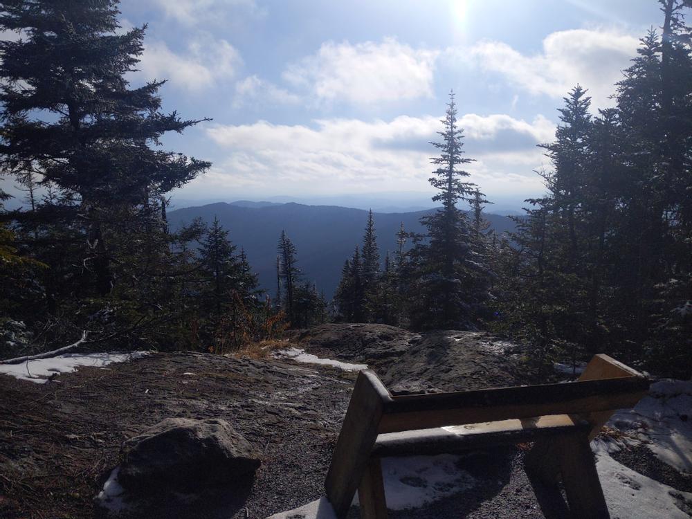 From the gated start of the Red Trail, the trail follow a fairly level grade for about 1 mile before it narrows and turns upward. The trail crosses the CCC road and a small lean-to where the trail forks. From here to the summit, hikers can take either the Red Trail or the West Peak Trail (blazed Blue Trail). The Red Trail leads to the north and offers beautiful views of the Kingdom, while the West Peak Trail (Blue Trail) leads to the south by two lean-tos. There is a particularly excellent vista to the east between the lean-tos and the intersection with the Red Trail.