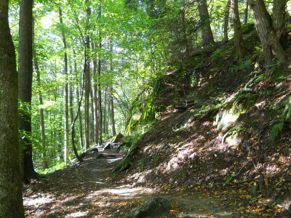 Single track trails, most of which are permitted for mountain biking, and well-used for that purpose. Elevation: Trails start at about 750’ elevation and climb to approx 1200’. The area is heavily forested with two vantage points having great mountain views, and furnished with special green chairs.