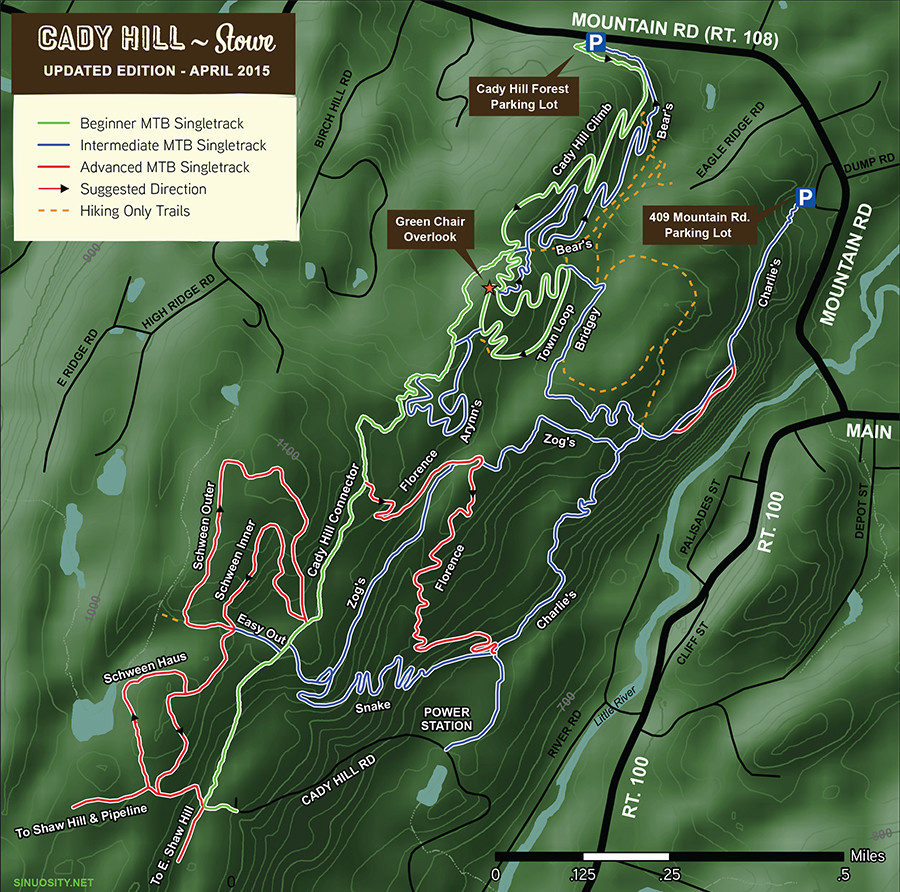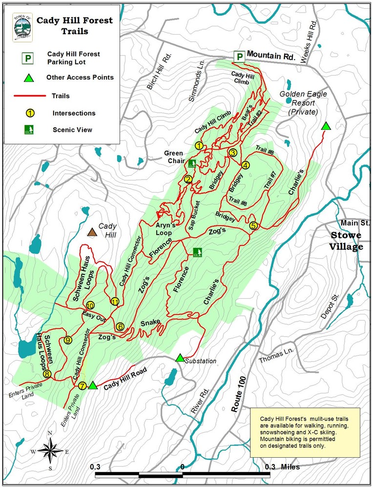 Town of StoweA 19-car parking lot located on Mountain Road across from the Town and Country Resort provides the primary year-round access. Also, trails can be accessed behind Iride Cycles across from the Baggy Knees Shopping Plaza on the Mountain Road and through the Cady Hill Road electric substation. Access from the end of Cady Hill Road is closed in the winter to protect deer wintering area habitat.