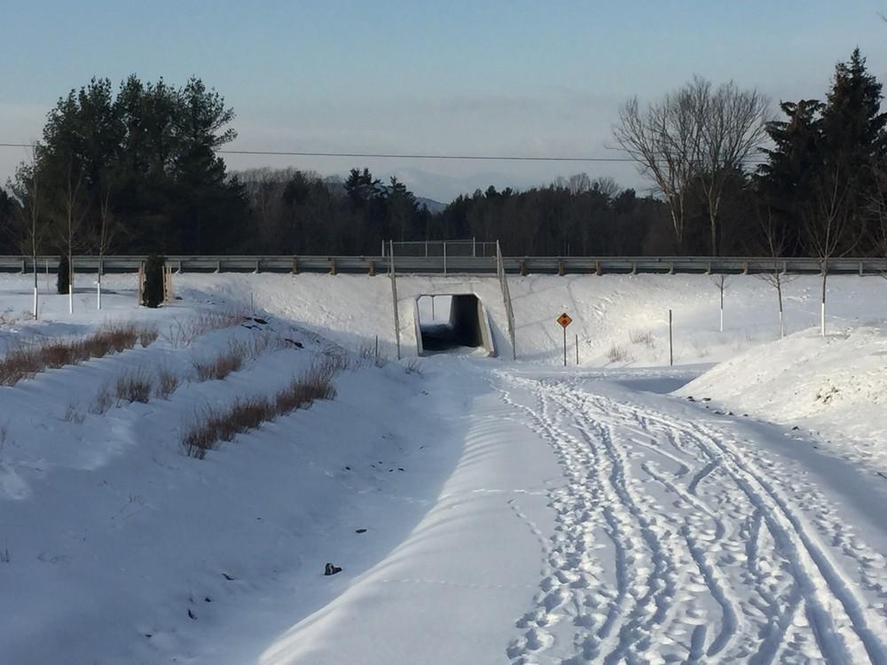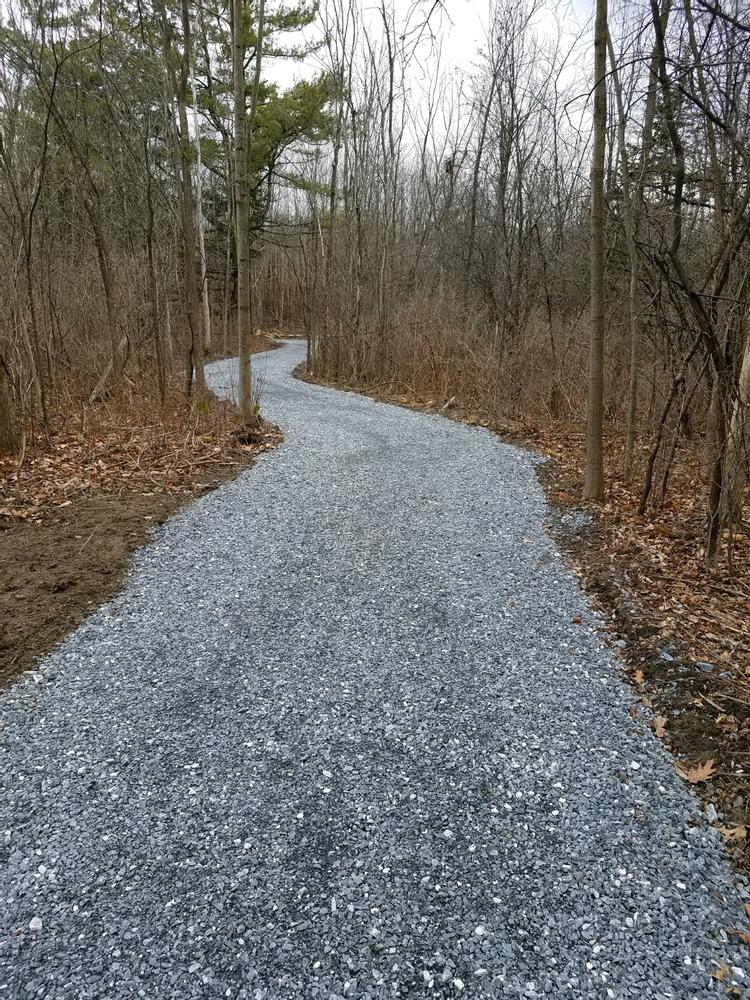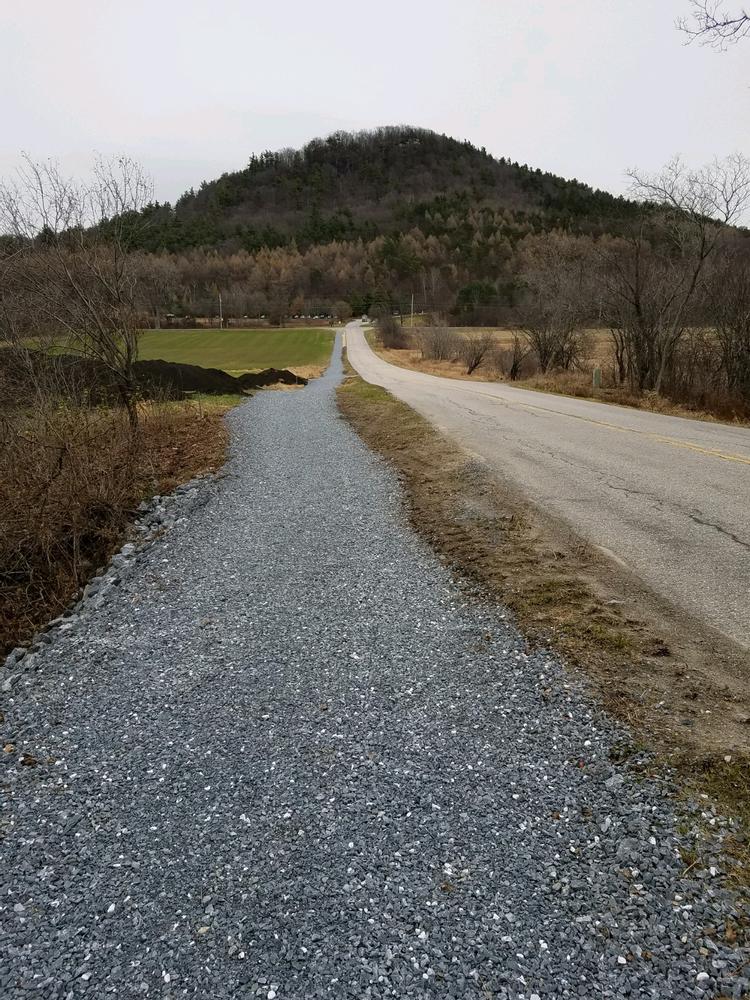 The State Park Road section is a crushed gravel, multi-use trail built in the fall of 2020 that connects Mt. Philo State Park to the rest of the Town Link Trail. It is 8 feet wide for most of its alignment, with one short portion that narrows between the road and a drainage. The path has mostly gentle slopes, with the exception of two short hills on either side of the narrow section. There are nice views of Mt. Philo to the east and the Champlain valley to the west, including Lake Champlain and the Adirondack mountains. The path goes through farm land and woods. While the path parallels State Park Road, it is separated from the roadway.