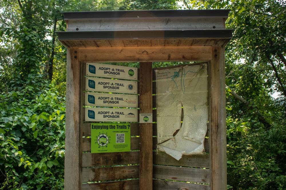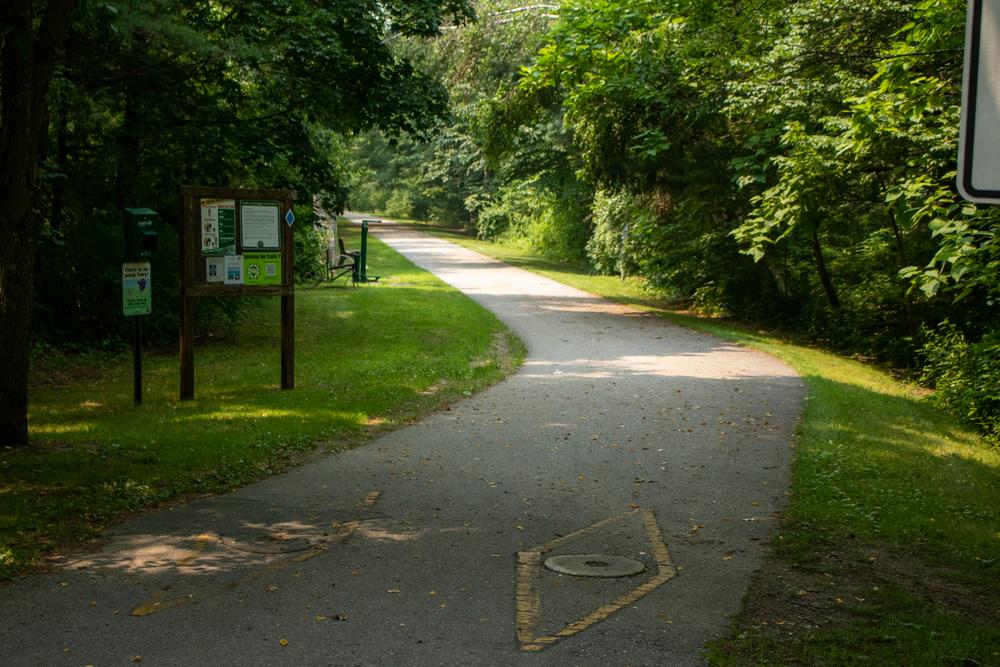 Access to the southern half of the trail: The southern branch of the trail begins in downtown Keene. To access the trail from the Keene post office, turn right (north) on Main Street and continue for 0.1 miles. Turn left onto Emerald Street and continue for 0.2 miles. Turn right onto School Street then right onto Gilbo Avenue. Make the first right into the parking lot off the right of Gilbo Avenue; the trail is between Gilbo Avenue and the parking lot.