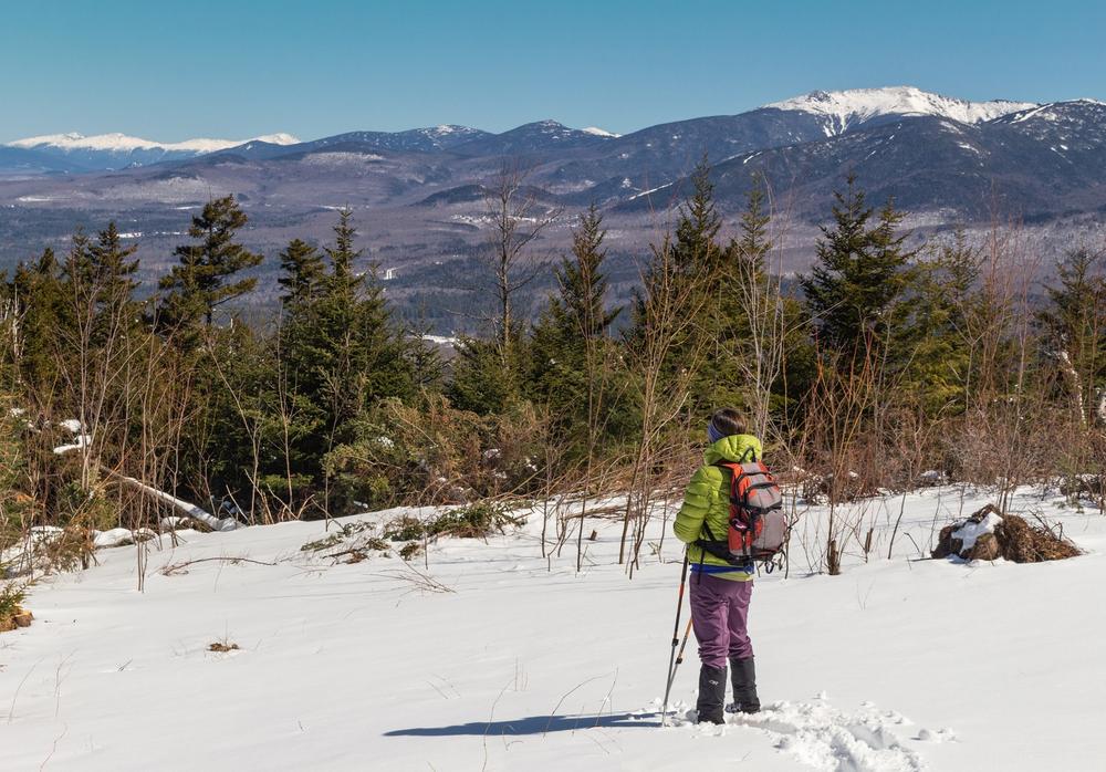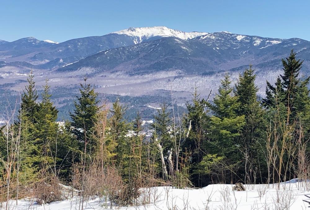 Climbing moderately, you pass several limited views to the north and soon reach the junction with the Red Trail, about 1.3 miles from the trailhead. Turn right to continue on the Blue Loop. For the next half mile, the trail is marked with blue stakes and follows a snowmobile trail, descending steadily to the northwest with views towards Vermont. Care should be taken on this portion of the trail as the surface is sometimes rough with no distinct footbed. Eventually you will reach a post with trail signs on your right; turn right here and head easterly down the northern side of the Blue Loop. The trailhead is about 1 mile from this junction.