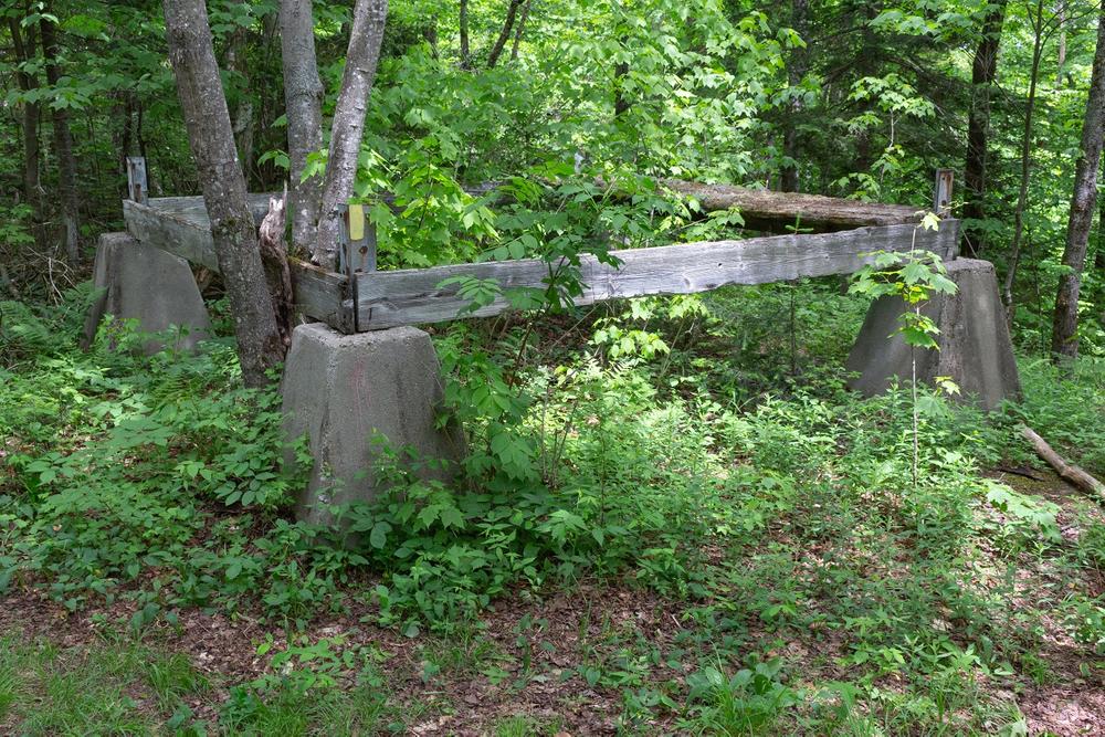 The Yellow Trail now traverses the eastern side of Cole Hill through an attractive forest with some ups and downs in the trail and several crossings of the backcountry ski trails. Just over half a mile from the last junction with the Blue Loop, the Red Trail heads off to the right to the summit of Cole Hill and the Yellow Trail crosses into the White Mountain National Forest. Winding along the ridge between Cole Hill and Cooley Hill, the trail passes through a beautiful fern glade and then crosses back into the Community Forest. You soon enter an open area that was extensively logged in the past—use care here as the trail, although blazed, can be a bit difficult to follow at times. Leaving the open area, the trail turns left and begins to ascend the summit of Cooley Hill. As it nears the summit, the trail ends at the White Mountain National Forest boundary and meets the Jericho Road Trail, which ascends Cooley Hill from NH Route 116. Proceed a short distance on this trail, passing a snowmobile trail on your right, to the site of the Cooley Hill fire tower. The remains of the fire tower can be seen to the left of the trail. Built in 1939 by the Civilian Conservation Corps, it was a 40-foot wooden tower that was used for about 10 years and then removed.