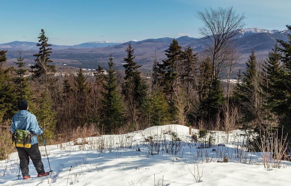 Leaving the kiosk, head south across the clearing and enter the woods. The trail soon crosses Salmon Hole Brook and begins to steadily ascend Cole Hill through a young forest. Enroute, you will pass a backcountry ski trail on your right; make sure you bear left here to stay on the Blue Loop. Just over half a mile from the trailhead, you reach the lower ledge that has a beautiful view to the north and east. The Blue Loop then continues to ascend, passes a junction with the Yellow Trail (with which it now coincides), and reaches the upper ledge. Here there is a sweeping view that extends from northeastern Vermont to Mount Lafayette and the Kinsmans—a great spot for a snack or lunch. Leaving the ledge, the Blue Loop soon reaches a second junction where the Yellow Trail heads south to Cooley Hill and the Blue Loop turns right. (NOTE: A backcountry ski trail also comes into this junction; make sure you take a sharp right to stay on the Blue Loop).