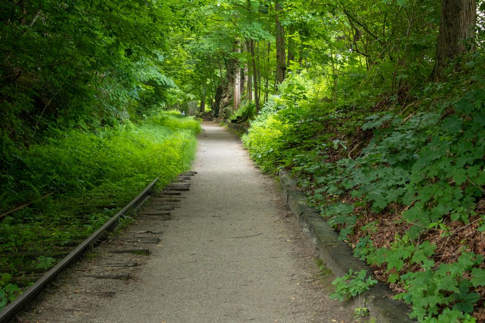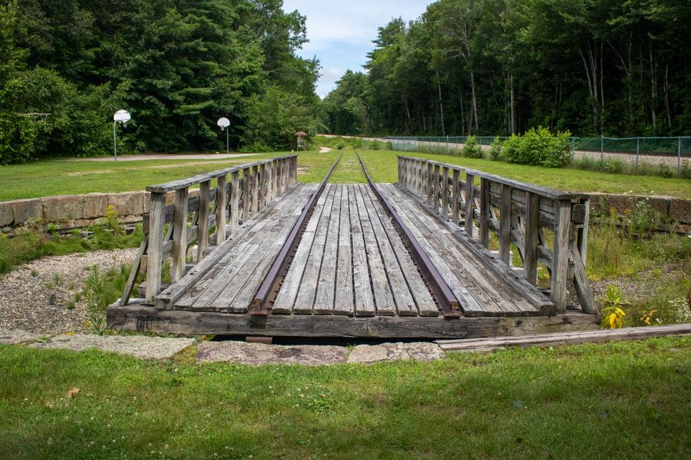 From the trailhead at the restored train depot on Railroad Avenue, the Russell C. Chase Bridge Falls Path leads to the rail-trail proper. There are trail brochures available at the trailhead, which list key points of interest marked along the way.