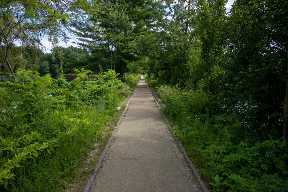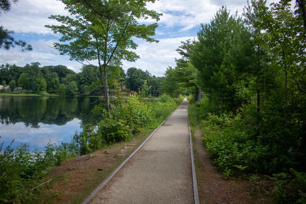 Causeways lead across Crescent Lake and along Lake Wentworth — at times the water surrounds the trail on both sides, and the views are spectacular. Locals use the trail for commuting to work and school, as well as for recreation and traveling between neighborhoods and the Allan H. Albee Public Beach on Lake Wentworth.