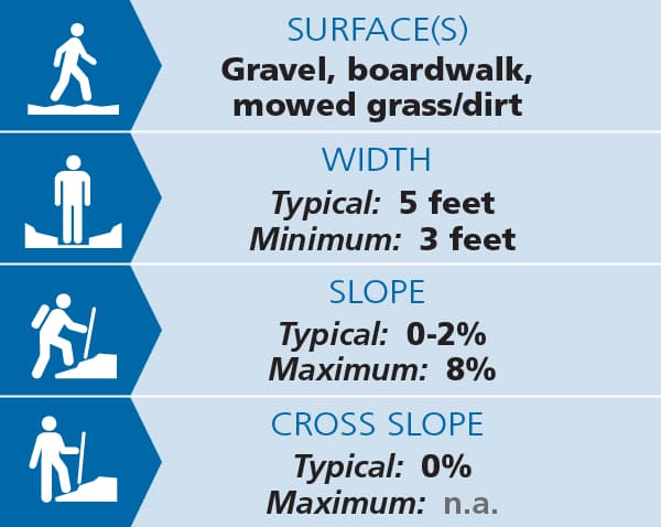 The beginning of the trail is well-packed crushed stone and hard-packed soil/grass, and includes a 15-foot section of 5% grade. It leads to a series of 5-foot wide boardwalks over the flood plain forest and wetlands. The first boardwalk includes a bump-out for resting/passing. All boardwalks include a 2-inch side lip along the edge, and some sections have thick railings as well. Between the boardwalk there are sections of crushed stone, with ramps leading up to and down from some of the boardwalk sections. This part of the trail is entirely flat except for the ramps, which range from a slight (1%) gradient to a few that are a steeper (6%-8%) grade. The return on the loop is hard-packed soil and grass, and is mowed frequently.