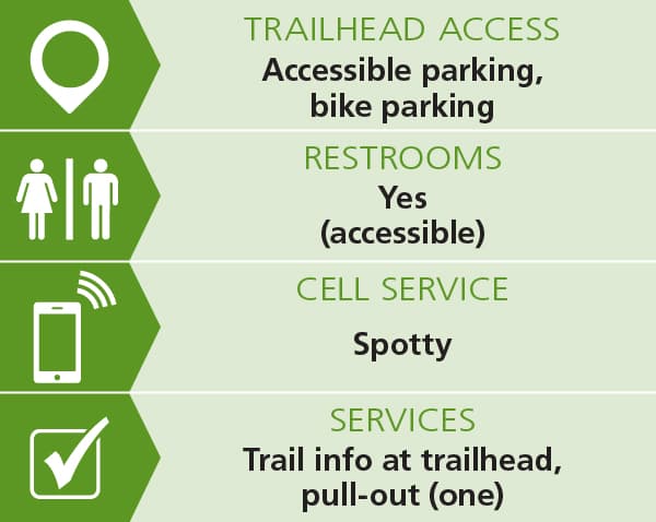 Please note: the trail can be very wet and/or flooded during the spring months. During these conditions, it is recommended to turn around after the first boardwalk and return back the same way you came.