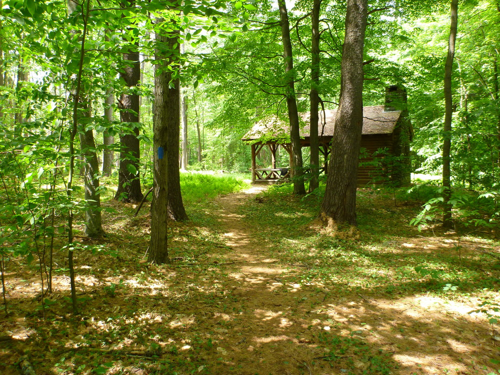 Myron Dutton Memorial Loop Trail (15-30 minutes, blue blazes): The loop trail follows the trails and roadways constructed by the CCC. The trail descends gently down a roadway and passes by the site of an old bathhouse and a modern water system for the Charrette Mobile Home Park. The trail nears Dummerston Station Road and makes a curve through an old parking lot and the original camping area. After passing through this level ground, it ascends steeply up to the picnic shelter and point of origin at the parking area.