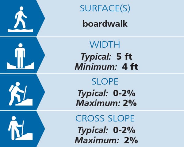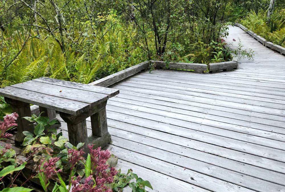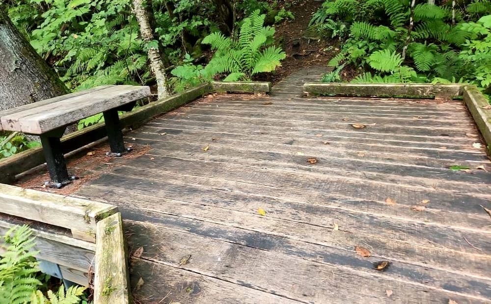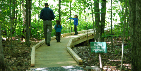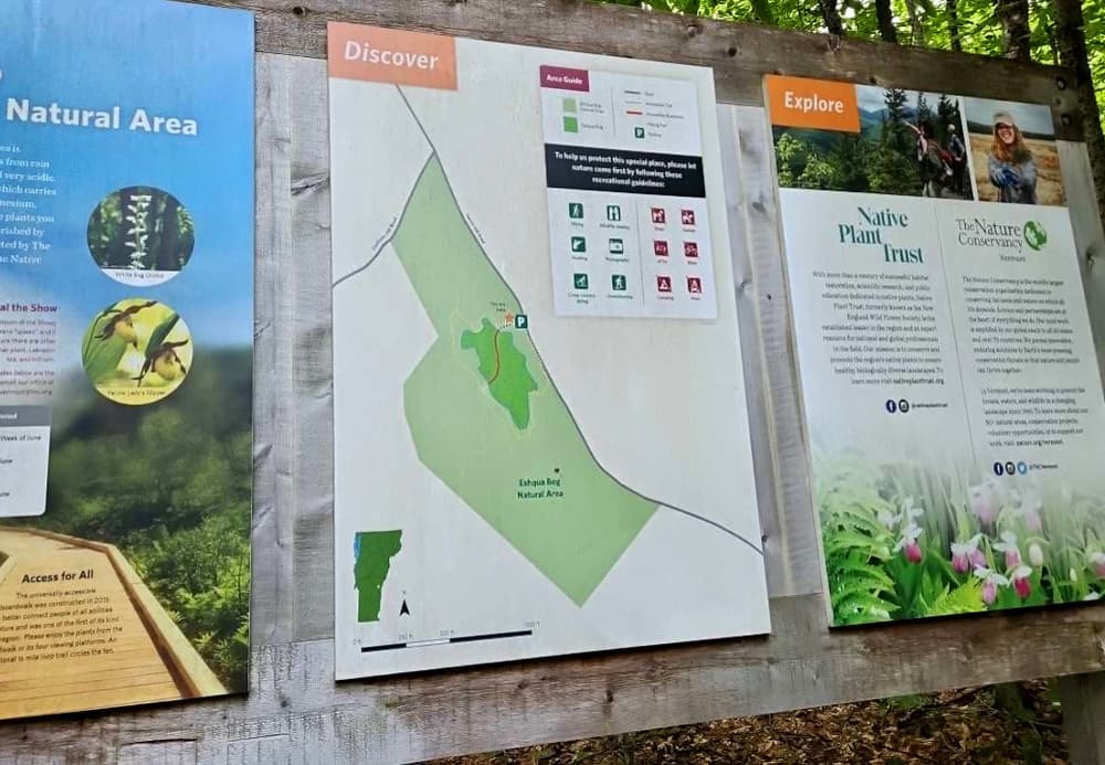 The one-mile primary trail includes a 460-foot accessible boardwalk. The trail to the boardwalk is 4 feet wide with a hard packed fine gravel surface. The boardwalk is 5 feet wide and has three platforms that are 10 feet wide to allow for passing. Both the stone dust and boardwalk surfaces have 0-2% slopes and cross slopes. Two of the viewing platforms have benches. From the boardwalk, visitors can experience the unusual and rare natural history of this plant community first-hand, without impacting its fragile ecology. A memorial bench constructed by the Hartland Nature Club stands near the beginning of the trail in memory of Graceann Ridlon and her work to protect Eshqua Bog. See Trail Access Information below for more information about this Accessible Experience.