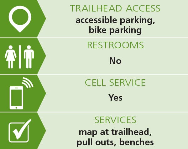The accessible trail begins from the upper parking lot. This parking lot includes marked accessible spots