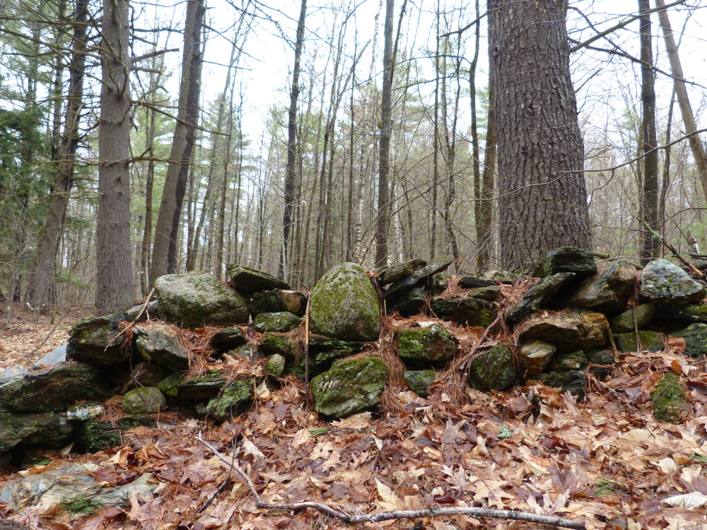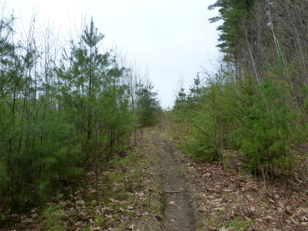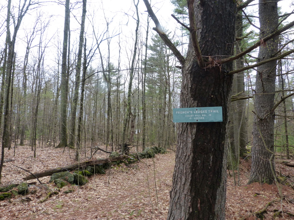 The blue-blazed Farnum Loop Trail enters the woods about 25 yards from the parking area across a mowed field to the west. On the other side of the road, to the east, is a yellow-blazed connector trail that links with the French’s Ledges Trail, bringing you to the Ledges in just over three-quarters of a mile.